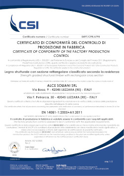 Rilasciato ed annualmente verificato da CSI, attesta che Alce Soliani Srl è abilitata alla lavorazione, trasformazione e marcatura CE a vista dei profili strutturali in legno massello. Puoi visualizzare il certificato qui: